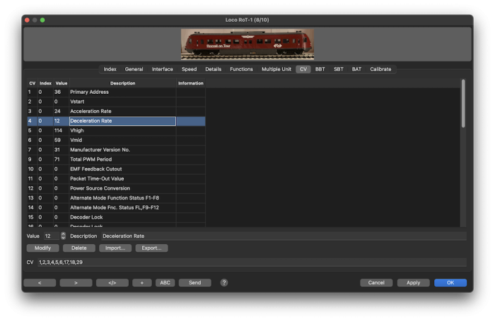 Dieser Karteireiter zeigt alle gespeicherten Register (CVs) für eine Lokomotive. Die Beschreibungen der Register sind von NMRA.org: http://www.nmra.org/standards/DCC/standards_rps/rp922.html, wenn sie nicht mit Ändern modifiziert wurden.